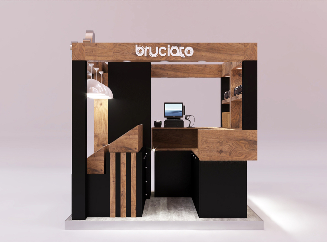 لوگو، رنگ‌ها و فرم‌های خاص شرکت به وضوح در طراحی غرفه دیده می‌شود
