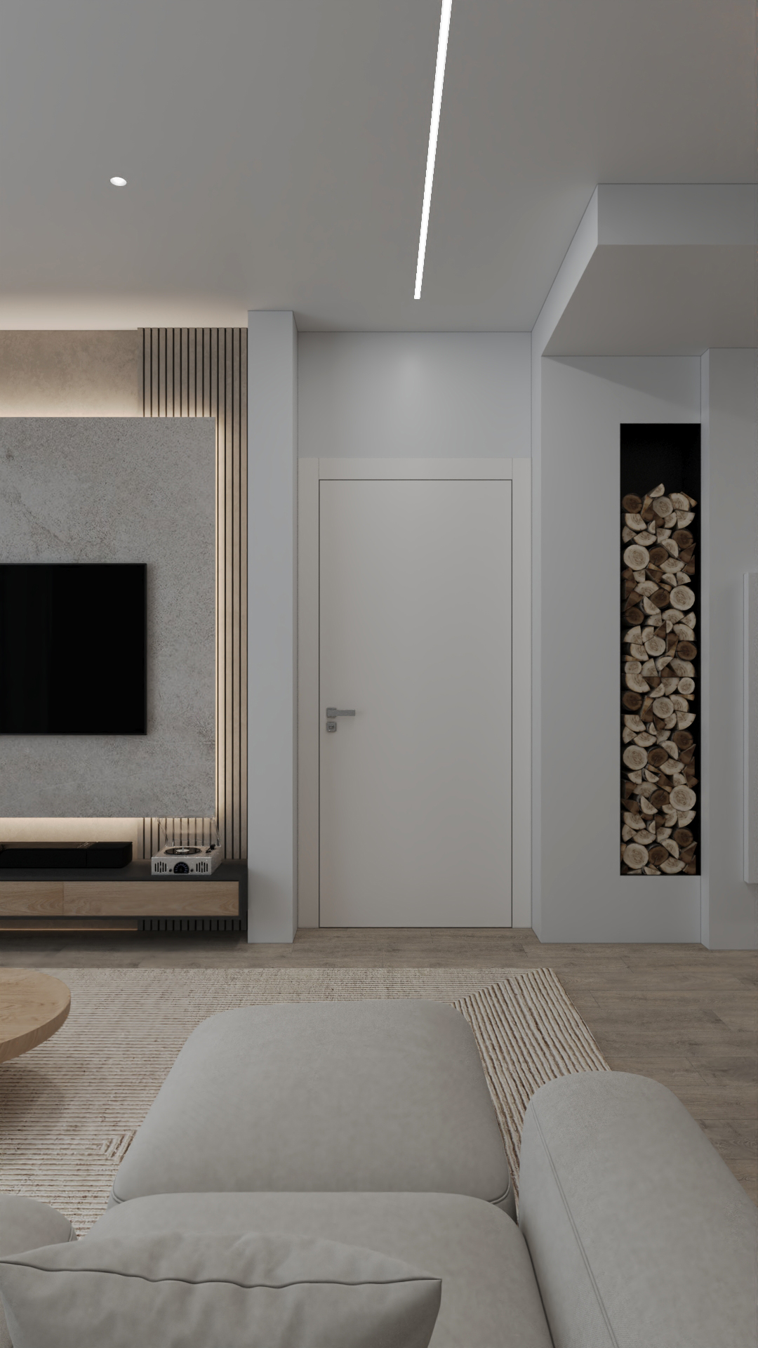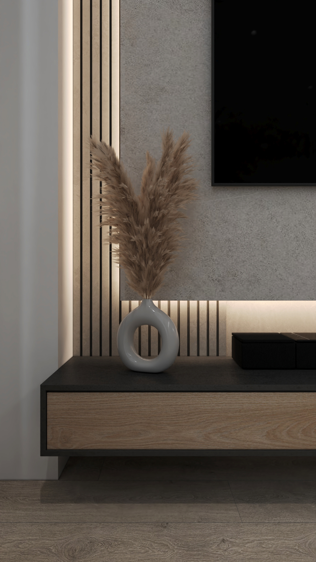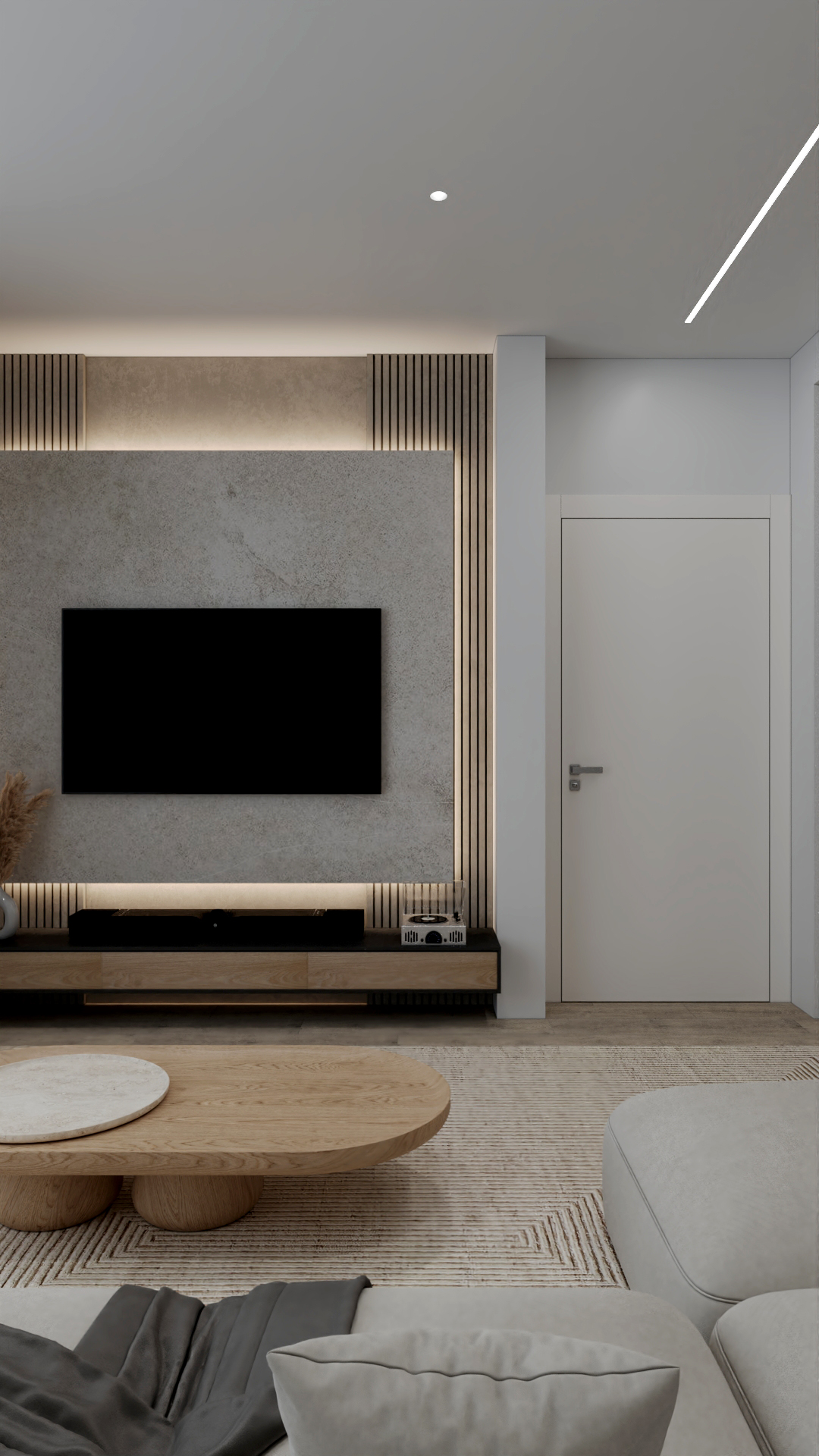 This project involved designing a TV wall in a residence located in northern Iran. Materials in natural, warm tones—such as wood and stone—were chosen to reflect the lush surroundings. The TV was integrated seamlessly into the wall to maintain a sense of calm and minimalism. Soft indirect lighting above the stone cladding enhances the texture at night, adding a subtle warmth to the space.