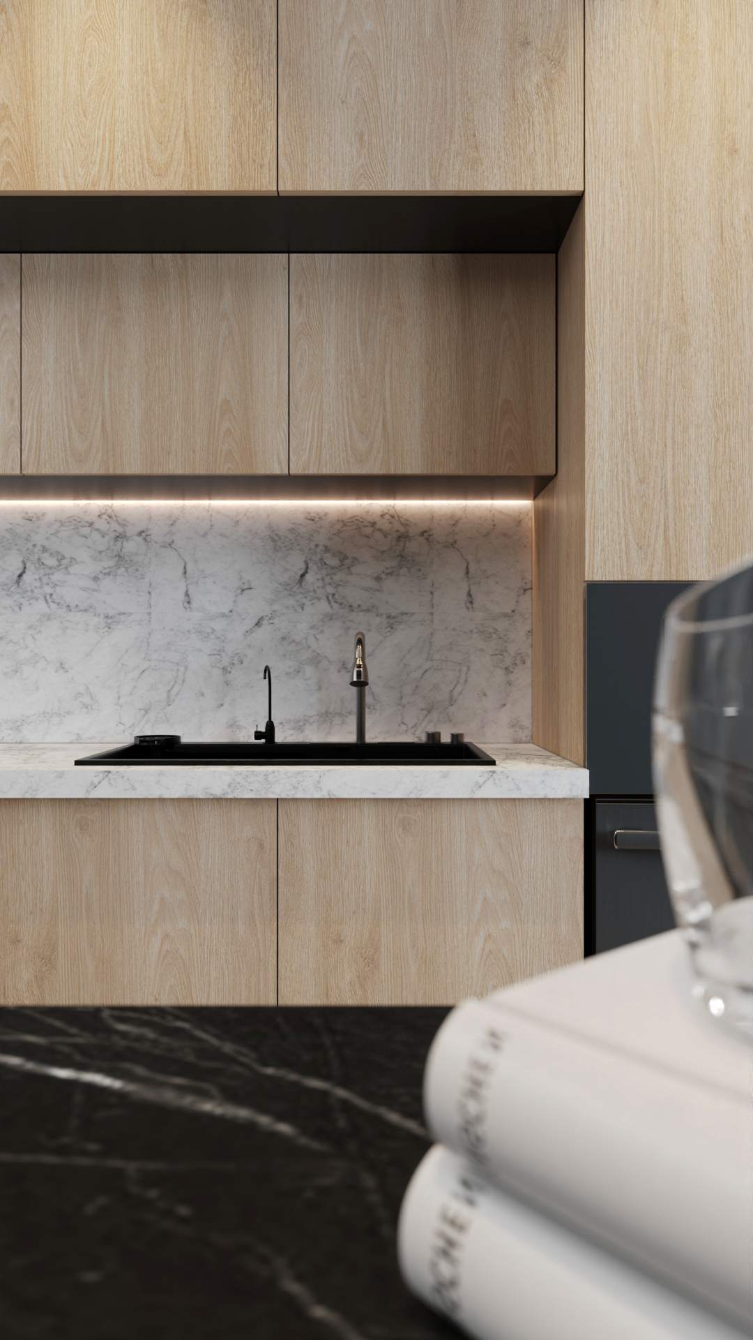The design of this kitchen focused on balancing functionality, minimal aesthetics, and material warmth. Handleless cabinets, seamless stone surfaces, and abundant natural light contribute to a sense of order and clarity. The wooden tones blend harmoniously with the floors and walls, creating an inviting atmosphere. The photos reflect the successful blend of natural and artificial lighting, offering a warm and efficient environment.
