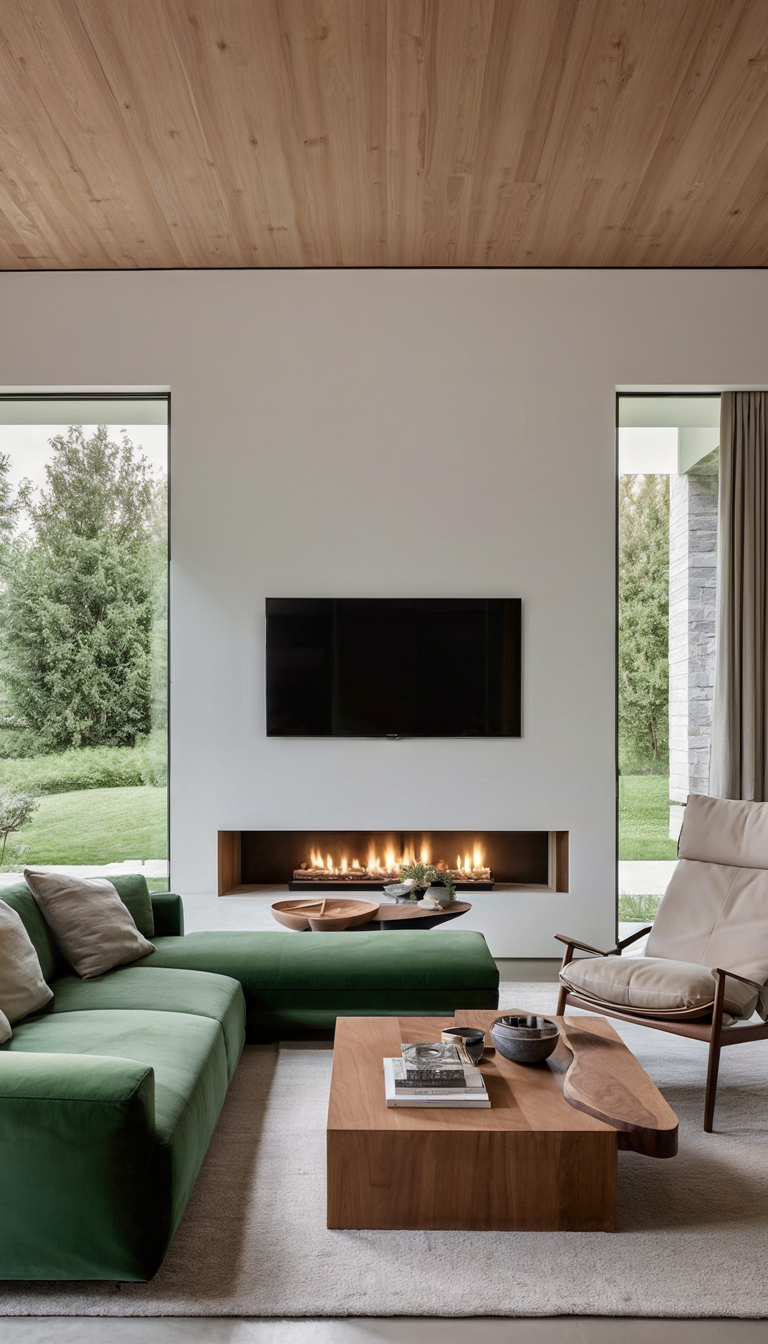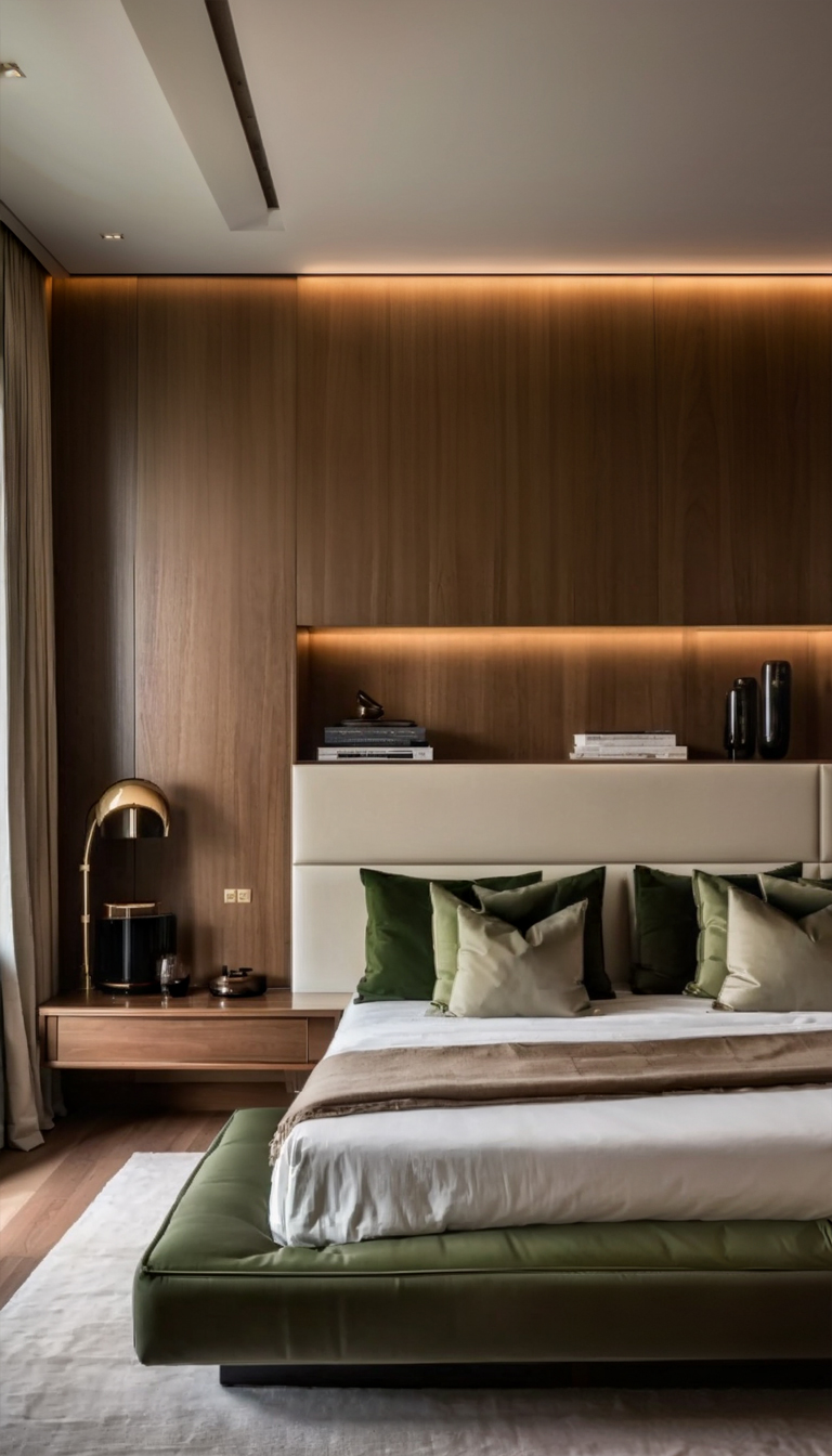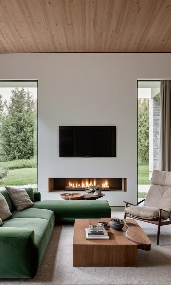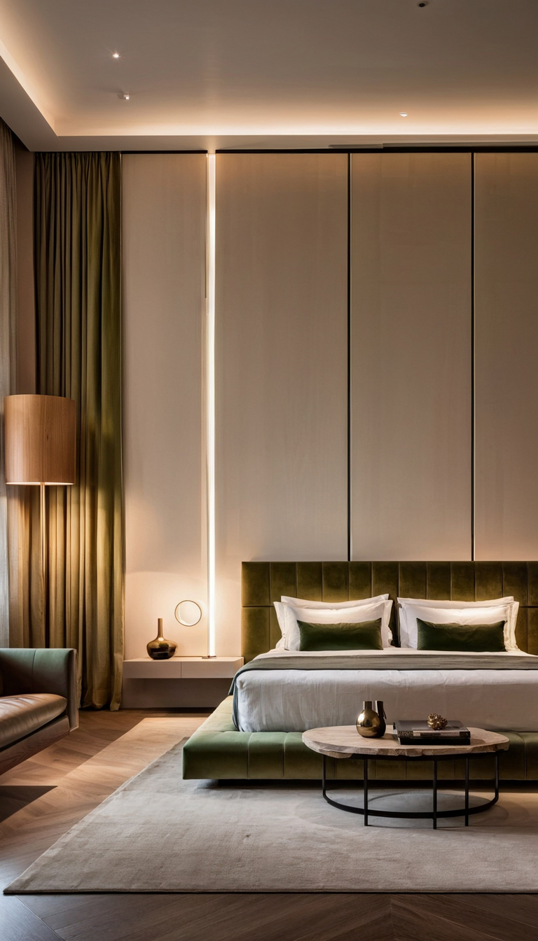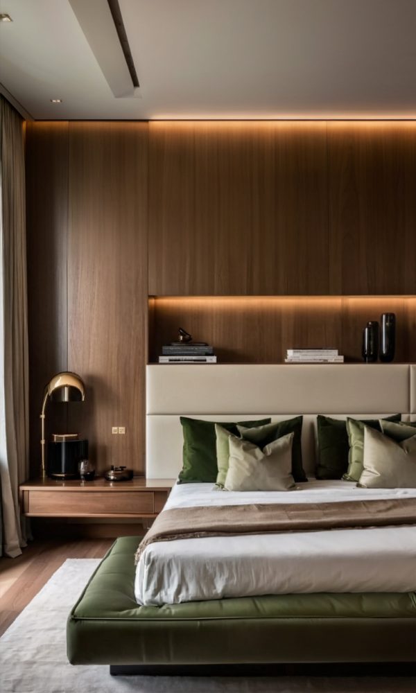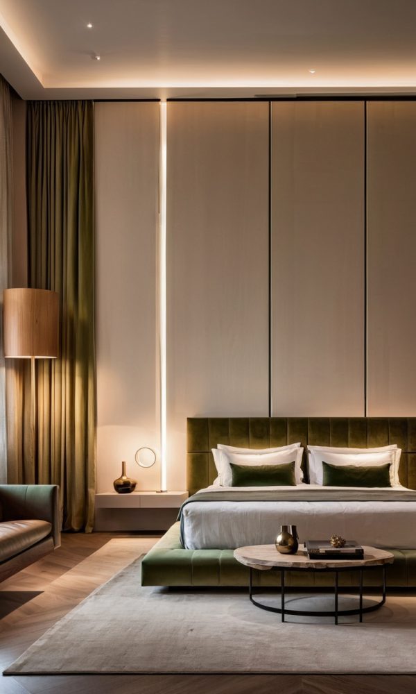 The color palette chosen for this project is a harmonious mix of moss green, white, cream, and wood tones, creating a soothing and inviting atmosphere throughout the villa. The use of these colors extends beyond just the walls, with furniture pieces like curtains, sofas, chairs, and even the walls themselves reflecting this elegant combination.