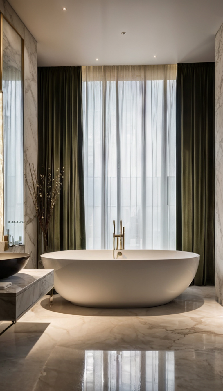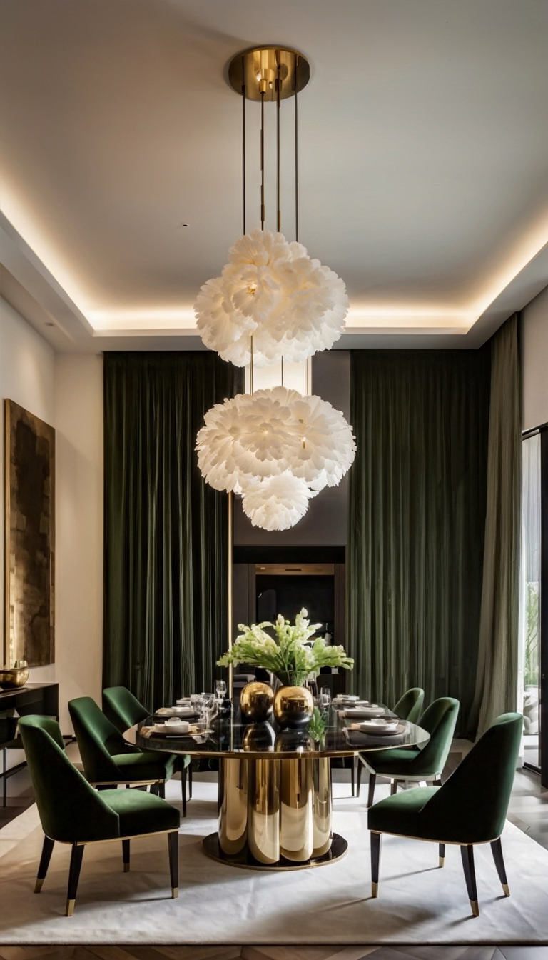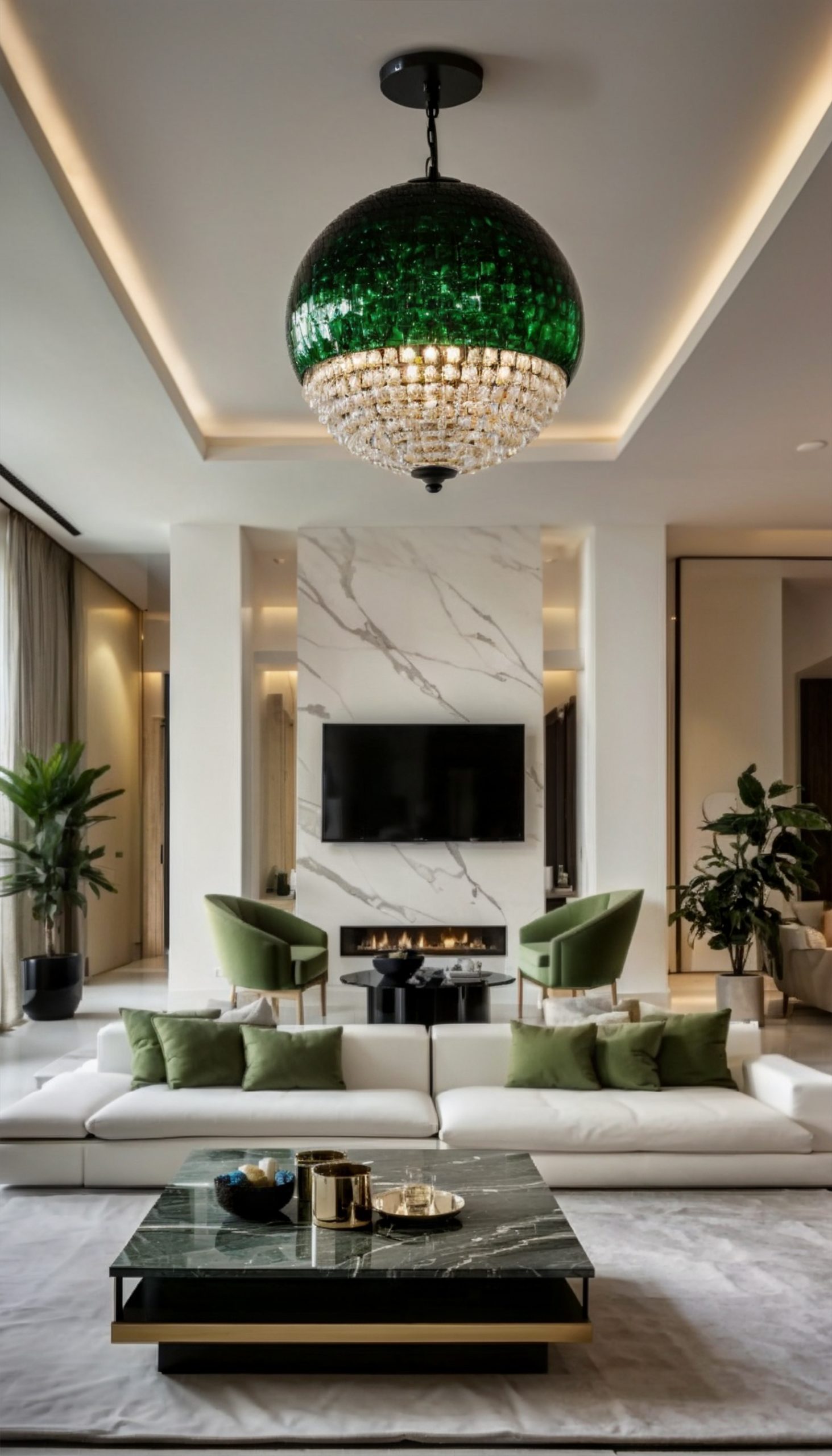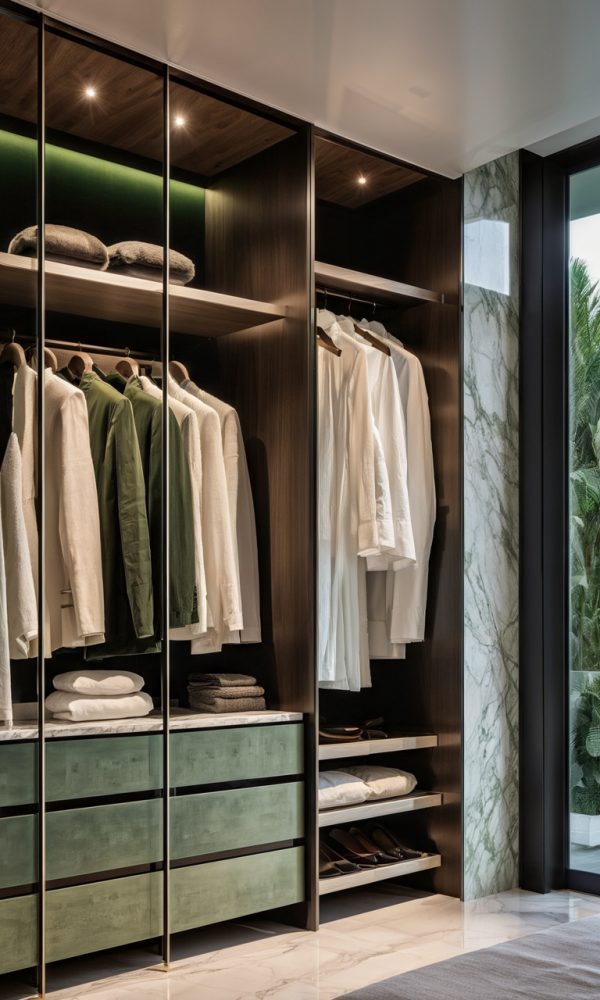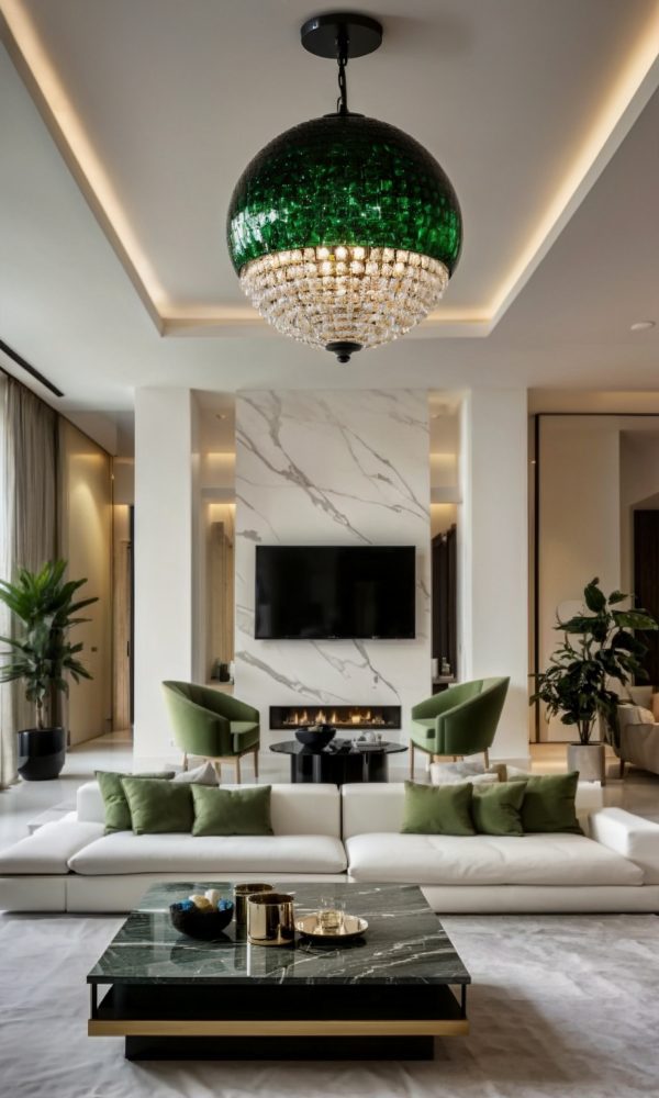 The color palette chosen for this project is a harmonious mix of moss green, white, cream, and wood tones, creating a soothing and inviting atmosphere throughout the villa. The use of these colors extends beyond just the walls, with furniture pieces like curtains, sofas, chairs, and even the walls themselves reflecting this elegant combination.